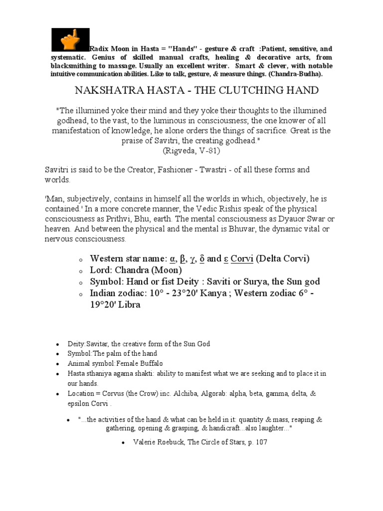Astroved Today The Moon Will Be In Hasta Constellation Or Nakshatra The Ruling Planet Of This Nakshatra Is The Moon The Presiding Deity Of This Nakshatra Is Savitar The Sun God Vic dicara illuminates the nature of hasta nakshatra's.